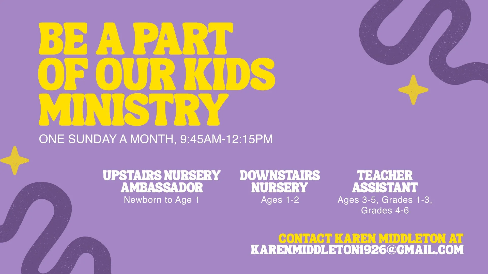 We are looking for Kids Ministry Volunteers for the following areas (commitment - one Sunday a month, 9:45am - 12:15pm):